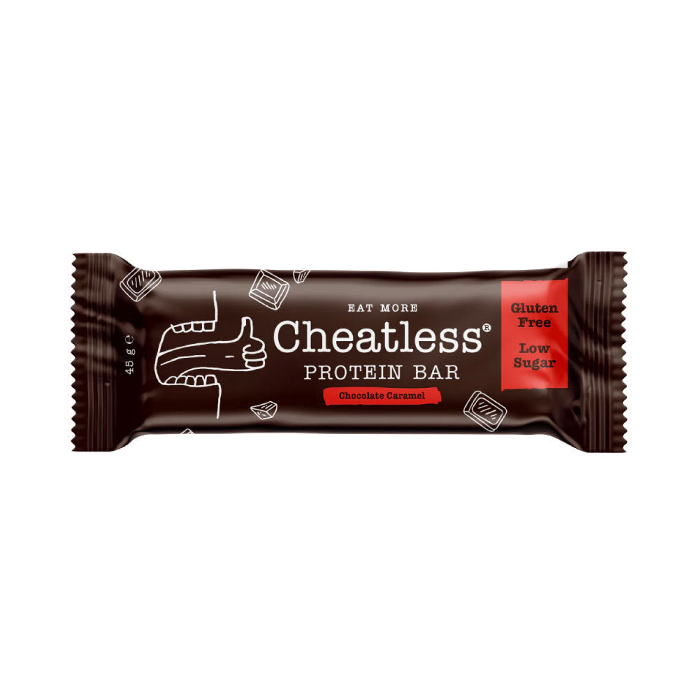 “Cheatless” Chocolate Caramel – tai minkštos nugos struktūros, pienišku šokoladu dengtas, šokolado skonio baltyminis batonėlis su karamele, šokolado gabaliukais ir eritritoliu. Daug baltymų (14 g), mažai cukraus (2.1 g), be glitimo.
